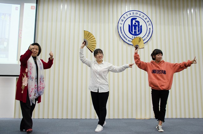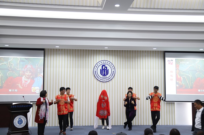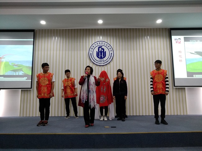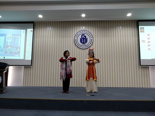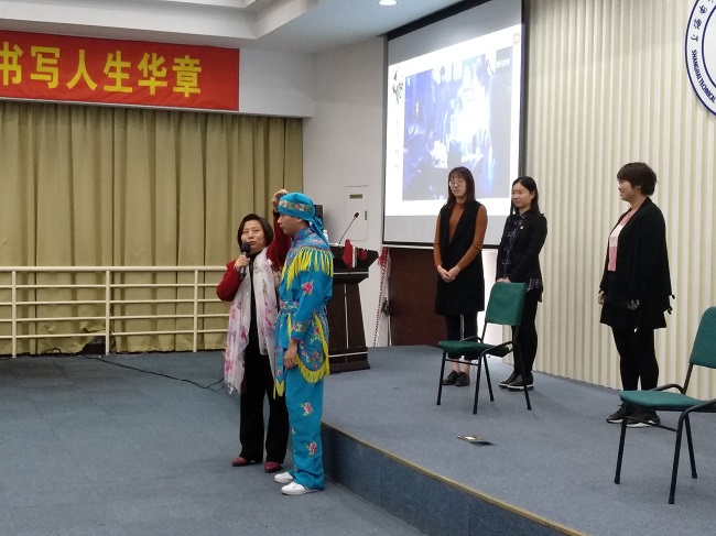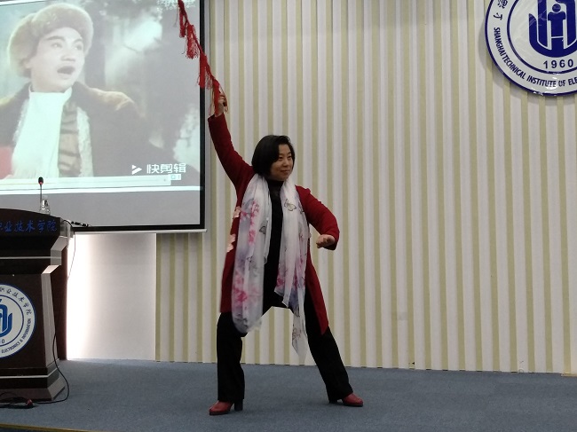 张艳萍老师详细地讲述了中华传统戏曲的历史传承、艺术特点、文化内涵等,并为我们现场演唱了《秦香莲》、《花木兰》等经典唱段,生动讲述了戏曲与各艺术形式的内在联系,通过《梁祝》、《杜鹃山》、《打虎上山》、《断桥》、《火凤凰》等经典片段的演绎,更是吸引了诸多感兴趣的师生们上台穿上戏服、拿着舞台道具体验,过了一把票友瘾,师生们的亮相展示收获全场阵阵掌声。张老师的艺术团队还与现场的同学们一同进行了一些戏曲动作的学习互动,解答了各位同学对于豫剧相关的问题。同学们深深地被中国传统文化的博大精深所吸引,对豫剧表演的精髓有了深入的了解。