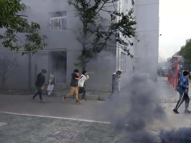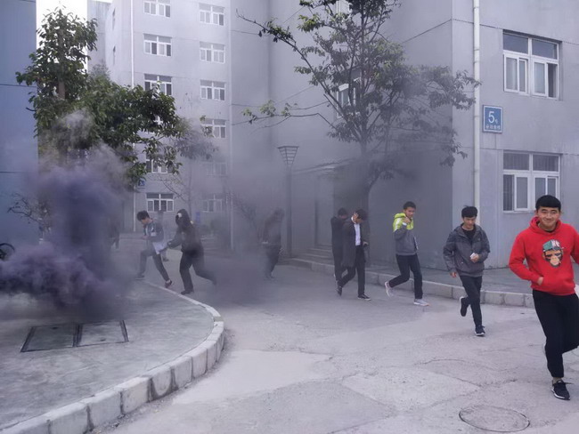 11月14日下午12:30,生活园区突然烟雾四起,警报之声遍布整个生活园区。瞬间各楼道传来“嗵嗵嗵…”的脚步声,只看见同学们一个个捂鼻、弯腰,靠墙行进,快而不乱,井然有序,全部安全撤离到指定场地。