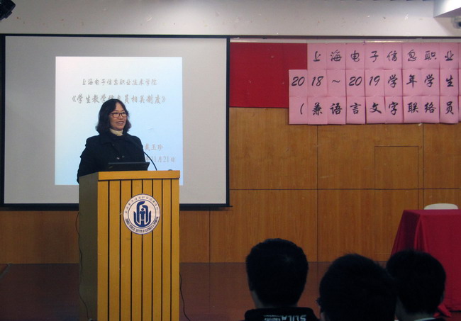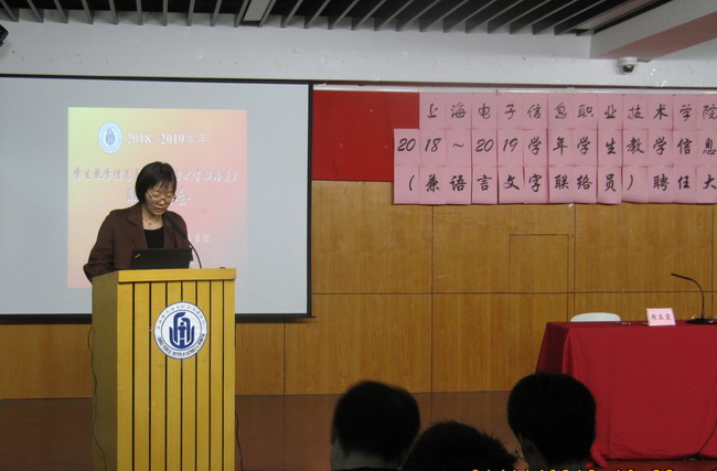 2018年11月21日, 2018~2019学年学生教学信息员(兼语言文字联络员)聘任大会在I401室召开,教务处副处长戴玉珍老师、教务处副处长周玉霞老师及全校学生教学信息员、各二级学院信息组组长与干事、校学生部部长与干事等出席了会议,周玉霞老师主持会议。