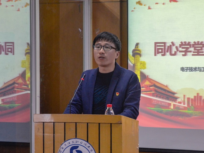 为深入贯彻落实习近平新时代中国特色社会主义思想、十九大精神和全国教育大会精神,电子技术与工程学院于2019年3月21日下午16:00在I401举行“不忘初心,永跟党走”党史党性教育培训班开班仪式暨同心学堂、日新学堂第一讲。学院党总支书记杨莹,学院党总支副书记、学院副院长陈真,专职组织员兼党总支办公室主任李根,学管办主任李翔及全体辅导员,学生干部和我院大一大二入党申请书、入团申请书提交学生参加了本次活动。陈真老师主持活动,李根老师就党建育人课堂“同心学堂”和团建育人课堂“日新学堂”作情况介绍。
