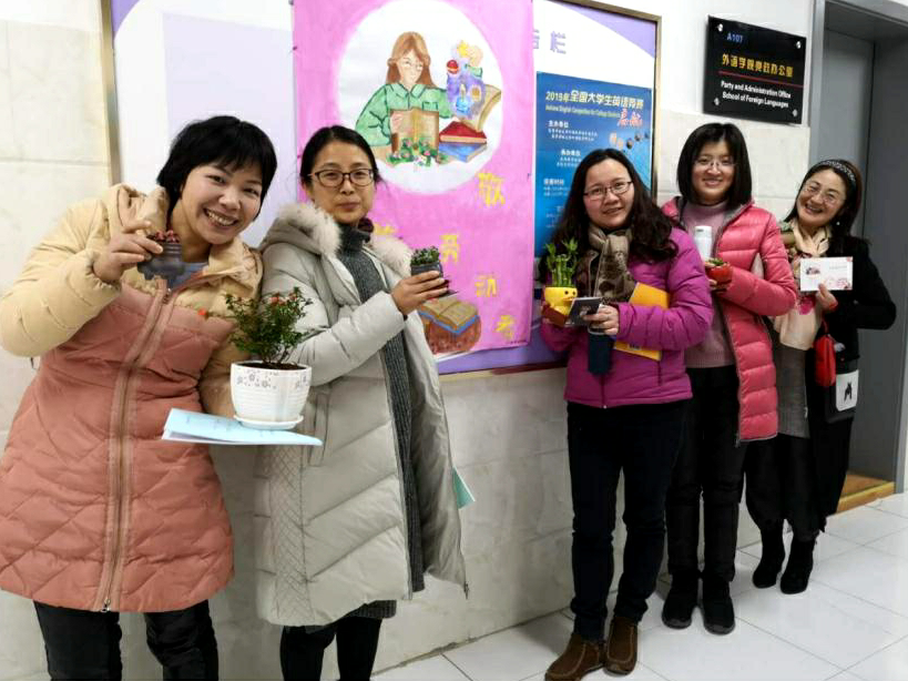 3月8日,外语学院教工团支部组织教师学习《新时代高校教师职业行为十项准则》,为感谢学院40位老师的辛勤工作和倾心付出,向老师们敬献了纪念绿植和承载学生们真诚祝福的卡片,祝愿老师们一片丹心绘青春,三尺讲台育英才,立德树人,桃李芬芳。