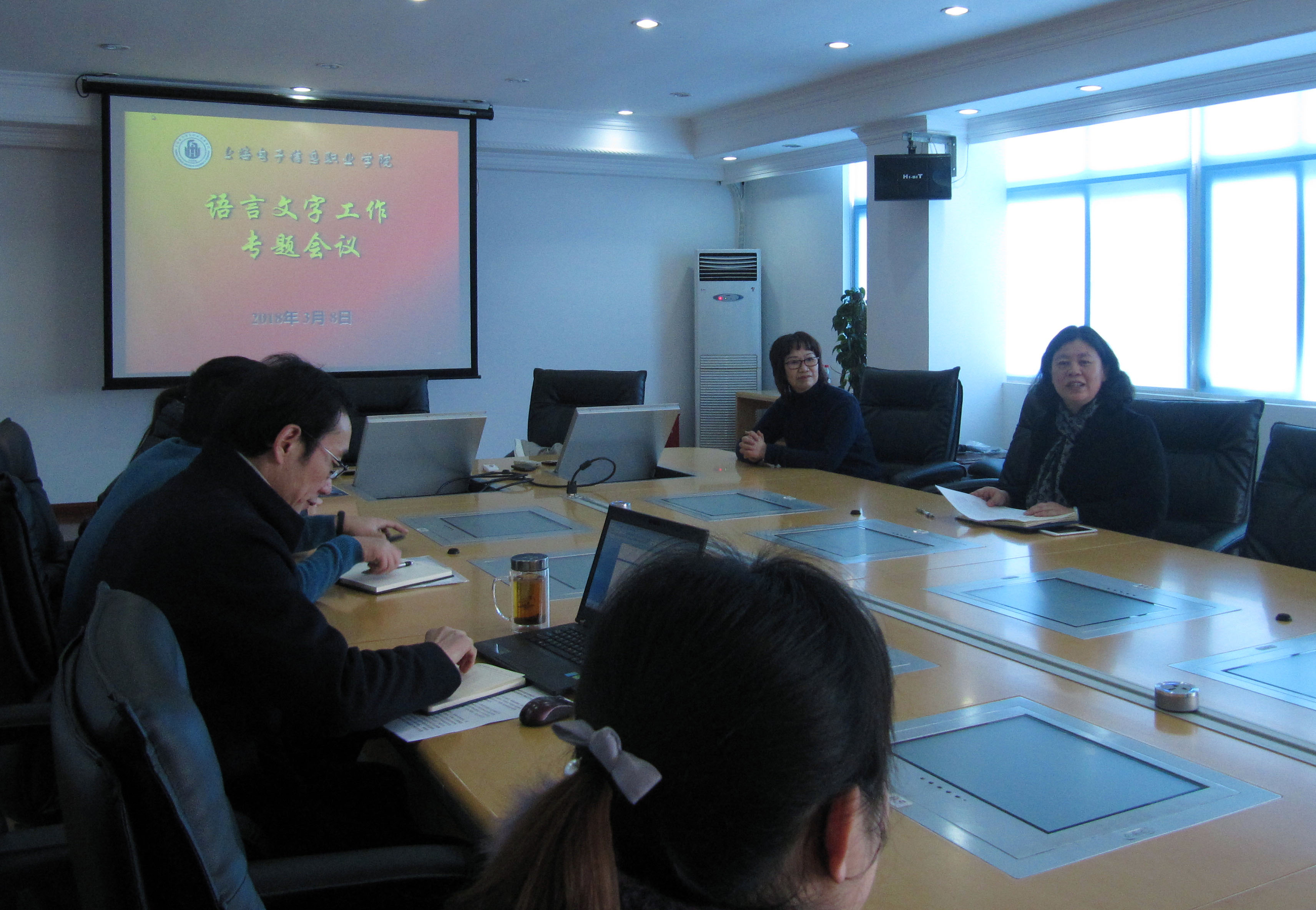 2018年3月8日,学校语言文字工作专题会议在奉贤校区B205召开。会议的主要内容是征集语委成员对《2018年度语言文字工作计划》意见,明确2018年度语言文字工作计划,便于下一阶段具体任务的布置。副校长窦争妍、教务处副处长戴玉珍、语言文字工作办公室全体成员参加了会议。 窦争妍副校长肯定了语委办草拟的《2018年度语言文字工作计划》和语委成员对语言文字工作做出的努力,也分析了当前语言文字工作存在的困难。她指出,在全校师生的努力下,2017年全校语言文字工作顺利评估达标。2018年面临的是,在已有工作经验的基础上,如何将语言文字工作系统化,如何促进语言文字工作的创新、如何把学校建设成更加卓越的语言文字工作规范化达标学校。 针对《2018年度语言文字工作计划》具体包含的内容,教务处副处长戴玉珍强调,2018年度工作计划是在以往工作经验的基础上,结合各教学单位、职能部门的职责,制定的合理计划。她从指导思想、组织架构、工作目标、工作安排、资金预算、注意事项六个方面给与会人员做了详细讲解。她指出,根据计划安排,2018年语言文字工作的重点是提高学生的普通话测试等级、加强语言文字研究课题的申报。 会上,针对2018年度语言文字工作计划的安排,姚光文老师对开展语言文字活动的责任部门划分提出建议;陈卫炉老师对计划中的用语措辞提出建议。各语委成员围绕自己的建议都做了典型发言,《2018年度语言文字工作计划》在语委成员的商讨中渐臻完善。(教务处)