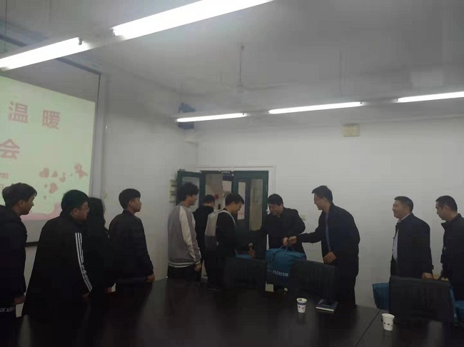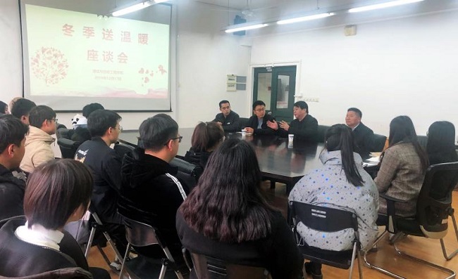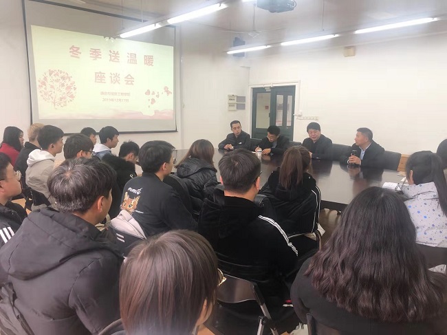 为贯彻落实十九大精神和习近平总书记在全国教育大会上的讲话精神,切实推进学生资助工作,更好地关爱家庭经济困难学生,在学校党政领导的关心下,2019年12月18日中午,通信与信息工程学院在J313会议室开展冬季送温暖活动。学校党委书记田钦、学工部副部长栾文飞、通信与信息工程学院党总支副书记、院长胡国胜、副书记、副院长姜涛、学管办主任、辅导员代表及20名家庭经济困难学生代表参加了座谈会。会议由姜涛老师主持。