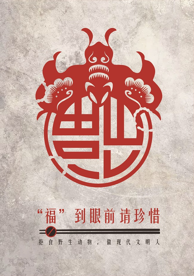 以上是18级产品艺术设计的陈雯琦同学在王奕老师的指导之下创作的作品《“福”到眼前请珍惜》。“蝠”通“福”,寓意有福气的意思,以传统图形“福到眼前”为主题,以过年窗花剪纸的形式来展现,被咬过的蝙蝠暗示了这次疫情的起源来自食用野生动物。只有人人拒食野生动物,才能从源头杜绝疫情,以此号召大家爱护野生动物,珍惜美好生活。