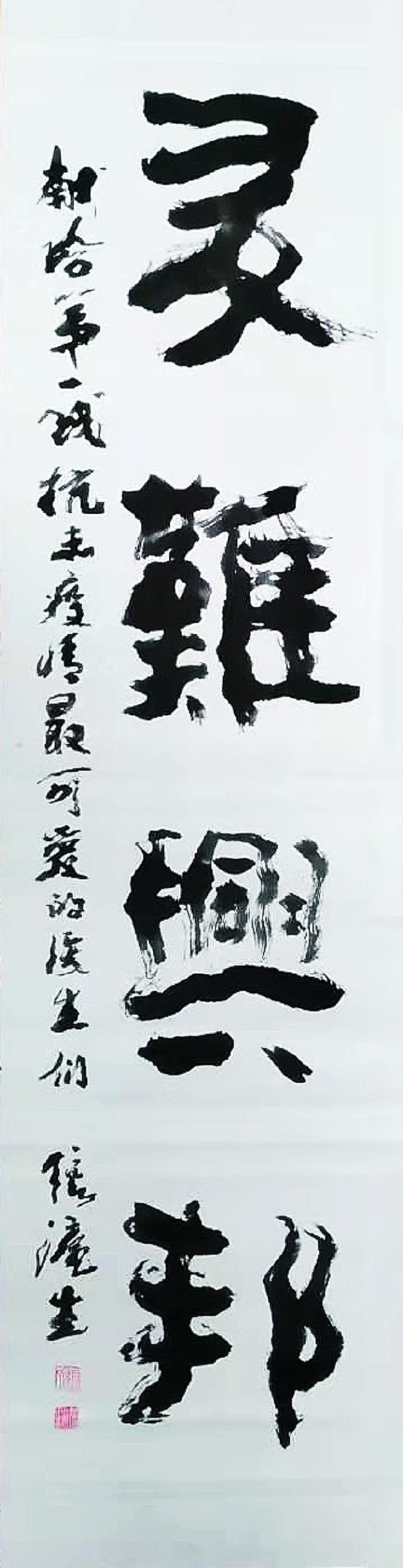 以上是张沪生老师的书法作品——《多难兴邦——献给第一线抗击疫情最可爱的医生们》,通过书法来表达对医生们的敬意。我们永远都不会忘记那一个个年轻的背影,也不会忘记钟南山院士奋勇当先的逆行。