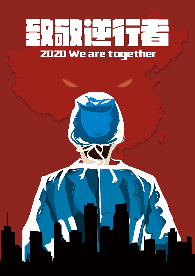 以上是18级数媒应用的贾思源同学在孙涵老师的指导之下创作的作品《致敬逆行者》。海报采用了城市建筑群的剪影(代表人民大众)与医护人员的剪影,中国地图以及一双新型冠状病毒病原体的眼睛。表达了在疫情来临之际,医护人员将人民大众挡在身后,体现了冲在一线的医护人员们不畏艰险的精神。同时,医护人员冲锋陷阵也少不了人民大众的支援,双方互帮互助,共同抵抗疫情。