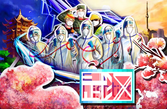 以上是18级影视动画的韩晓蝶同学在高阿兰老师的指导之下创作的作品《武汉,fighting!》。作品前景为粉色的樱花树,背景为武汉的地标建筑黄鹤楼、武汉龟山电视台。自疫情暴发以来,解放军、医护人员、建筑工人,来自全国四面八方的“战士们”前赴后继的奔向前线,每个人手上的红丝带,表明大家同心协力,众志成城,并肩作战,共同面对这场没有硝烟的战争。
