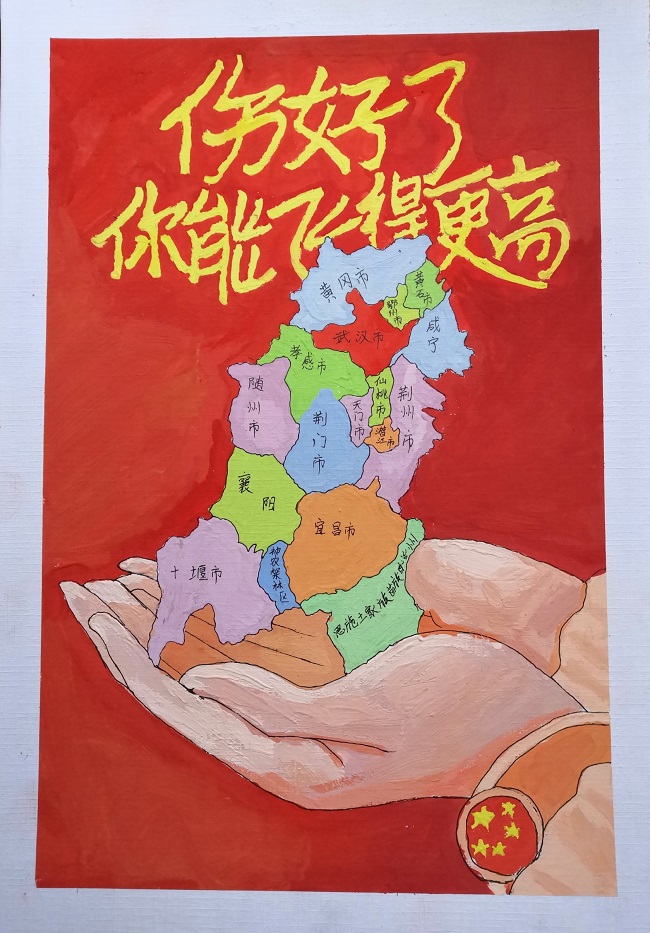 以上是19级环境艺术设计的程勇同学在周学佳老师的指导之下创作的作品《伤好了,你会飞的更高》。湖北省在祖国妈妈的手心里,宛若一只受伤的小鸟,就像钟南山院士说的,武汉是一座英雄的城市,等这座城市痊愈后,一定会再次展翅高飞!