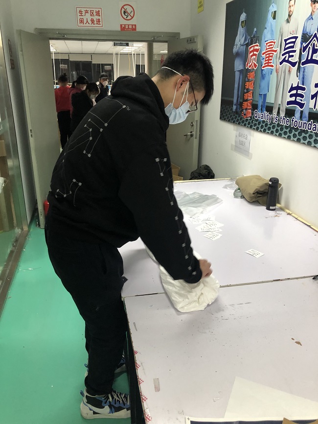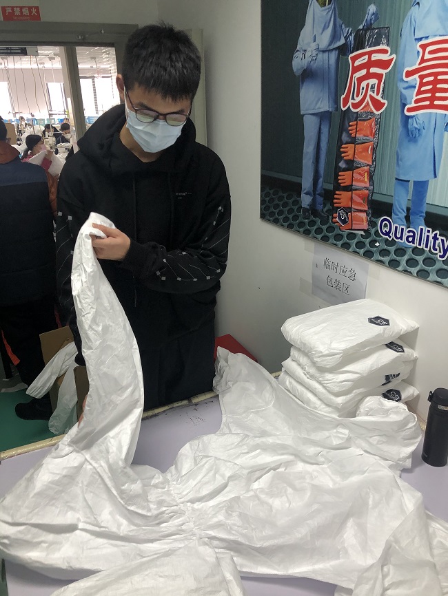 与此同时,在前线医疗物资紧缺的情况下,作为一名共青团员,谈澄同学积极报名了浦东新区青年志愿者工作,成为上海市浦东新区防护服生产服务志愿者中的一员。志愿服务的第一天从早上八点到晚上九点,历经十几个小时,他们团队共完成了35箱2100件防护服的打包装箱。身高185cm的他,长时间的弯腰虽带来了身体的不适,但他投身防控一线的决心始终不变。他说:“作为一名团员,要以自己的实际行动向组织靠拢,为成为一名合格的警察做好准备。”