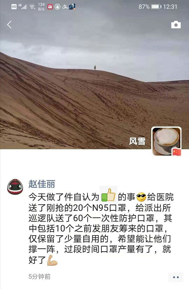 /span> 我院毕业生赵佳丽同学,她把自己费尽心力抢购的20个N95口罩送给了医院,60个一次性防护口罩送给了派出所巡逻队。尽管口罩的数量并不大,但是这份在特殊时期的爱心却让这个冬天不再寒冷。