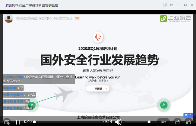 面对本次新冠肺炎疫情的挑战,通信与信息工程学院腾讯网络安全产学研协同创新基地在学院领导的关心指导下,与合作企业——上海豌豆信息技术有限公司克服困难,通过开启“空中课堂”,让创新基地成员们在线上重新“归队”。