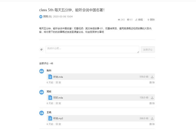/strong>课堂教学上注意节奏的把控,除了常规的课后作业外,还注重对学生的长短周期项目训练,如每日计划、每周学习等等。阴玥老师的《英语听说》课程根据学生特点设置“每天五分钟,能听会说中国名著”版块;《英语精读》课程提出了了每周课后观看“Hello China 英语学习中国文化”的要求,增强了学生的体验感,激发了情感共鸣,培养了青年学生的爱国主义情怀。/p> 认真落实在线教学要求的同时,外语学院还通过网络组织全校2018、2019级约100名学生参加了首届“钉钉杯”全国大学生写作大赛。学院赛事指导老师通过在线作文评阅系统对学生作品给予指导。经过激烈角逐,李昕、胡雨慧等6名同学的作品成功进入了初赛评选。/span>赛事组织通过网络将第一课堂与第二课堂相结合,培养了学生独立思考的能力和注重日常积累的学习习惯。