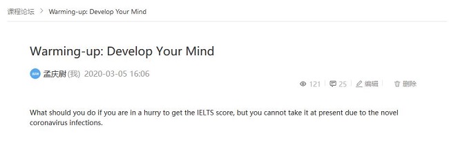 抗疫特殊时期,外语学院按照学校要求,坚持以学生为主体组织线上教学,精心打磨课程。在授课方式上,做到线上与线下相结合——线上聚焦高密度、短时长的讲授和指导,线下促进学生自主学习与研究性学习。孟庆尉老师的《英语写作》课程调整授课方式,教师从“给予”到“激发”、学生从“被动”到“主动”。在留学申请书写作项目中,教师以“新冠肺炎疫情背景下,学生如何联系学校拿到雅思成绩”为话题,不但帮助学生做到学以致用,更是把爱国主义教育、理想信念教育融于其中,为身处疫情防控下的学生们答疑解惑、振奋精神。课程注重培养学生主动思考和解决问题的能力,为疫情结束后的学习做好准备。/p>