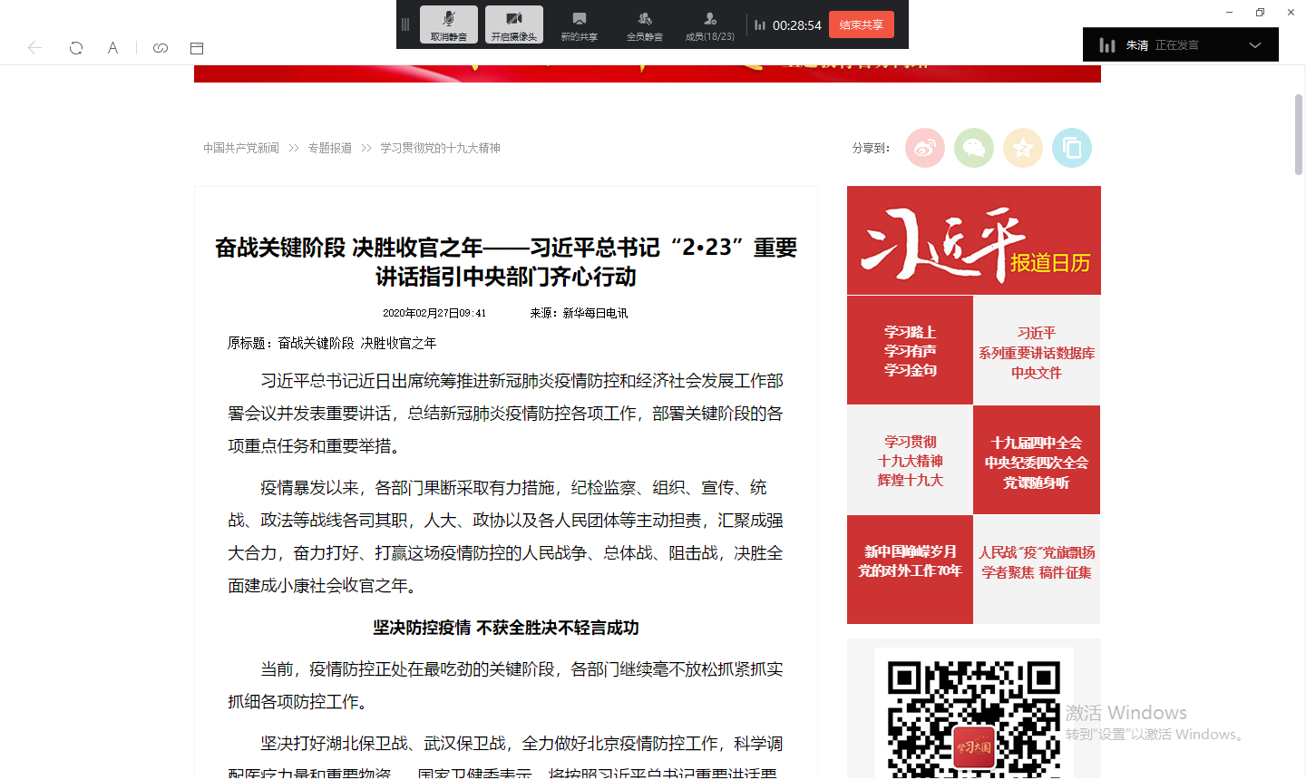 首先,朱清同志介绍了公共基础学院防疫工作基本情况,老师们以身作则,积极捐款捐物,为战“疫”奉献了自己的力量。在此期间,公共基础学院制定了《在线教学实施方案》,同时按照“三重一大”决策机制,通过召开教职工代表会议、教研部主任会议和党政联席会议等,制定了《公共基础学院在线课时费发放办法》。接下来朱清以“奋战关键阶段,决胜收官之年——习近平总书记‘2·23’重要讲话指引中央部门齐心行动”为题,带领大家认真学习习近平总书记重要讲话精神,把思想统一到疫情防控上来,把力量凝聚到共同打赢疫情防控阻击战和推动经济社会发展上来,扎实做好疫情防控期间各项工作。