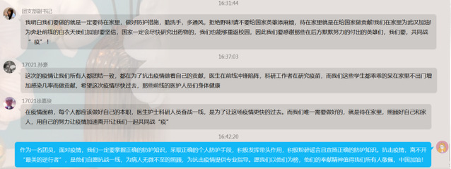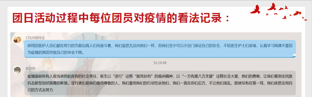 17021-24团支部制作主题团日活动学习素材,观看抗疫短视频,引发团员线上热烈讨论。18023-24团支部的同学们自发将零用钱捐出来,为这场全民的抗疫“战争”增添力量。在全民“抗疫”的战争中,各行各业涌现出许许多多艰苦奋斗、英勇无畏的人民英雄,如白衣天使、志愿者以及军人战士等。在团日活动中,团员青年纷纷向他们表达了敬意,表示要学习他们身上可贵的奉献精神,凝聚、发挥青年学生的正能量。