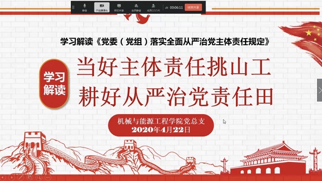 从/span>“打铁还需自身硬”到“打铁必须自身硬”,我党自我革命、从严治党的脚步从未停歇。今年3/span>月/span>9/span>日,中共中央办公厅发布了《党委(党组)落实全面从严治党主体责任规定》(以下简称《规定》)。为传达中央关于全面从严治党的最新要求,强化党员干部纪律性,维护良好政治生态,永葆党的先进性和纯洁性,机械与能源工程学院党总支中心组成员于/span>2020/span>年/span>4/span>月/span>22/span>日集体学习了《规定》。学习会议由党总支书记何永艳主持。/span>/span>/p> /span>/span>/p> 会上,何老师对《规定》出台的背景、落实全面从严治党主体责任的原则以及如何落实全面从严治党主体责任进行了详细解读,并传达了学校关于全面从严治党的会议精神。何老师强调,党的自我革命只有进行时,没有完成时,行为的变化依靠思想的变化;落实全面从严治党主体责任重在日常、贵在有恒;要做到思想与制度结合、党内与党外结合、防与惩结合;要注重责任传导。在对《规定》内容充分研读的基础上,中心组成员发表了自己的学习体会。李露霞老师认为落实全面从严治党主体责任过程中要做好相互监督,防止出现/span>“灯下黑”,及时指出同事的问题也是关爱的体现,大家要形成合力,按照《规定》的要求,将专业建设和育人工作作为试验场,积极推动各项工作开展。王晓栋老师表示,作为一线教师要扛好肩上的责任,按规矩、按制度开展教学工作,尤其是现阶段的在线教学,既要改革创新,又要结合“一以贯之”的教育精神,不能让“停课不停教、停课不停学”流于形式。周苑老师结合分工会工作谈到,负责、守责、尽责要体现在每个党组织、每个岗位上,近年来工会在制度制订和工作落实方面越来越规范,内部凝聚力也逐步增强,在工作开展过程中接受监督、倾听不同的声音是非常重要的。/span>/p> /span>此次学习是对落实全面从严治党主体责任要求的整体梳理,拧紧了党员干部思想的“总开关”。习近平总书记曾说,我们是革命者,不要丧失了革命精神。从自身建设出发,加强学习、勤于反思、自我净化、自我革命,是落实全面从严治党主体责任的重要环节。(作者:王晨怡 供稿单位:机械与能源工程学院党总支)/p>