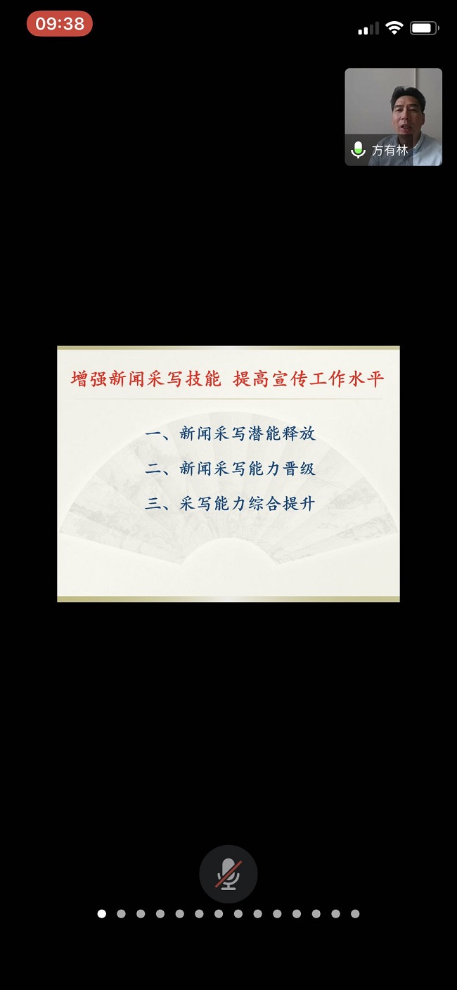 本次培训采用在线课堂的形式进行,方有林教授以《增强新闻采写技能,提高宣传工作水平》为题,对新闻写作的概念、基本方法与技巧、注意事项、新闻素养提升等作了详细讲解,并以校园日常新闻稿件采写举例分析,切合实际,通俗易懂。方教授从“新闻采写一点不难、新闻采写晋级有门、采写能力提升之道”三方面,循序渐进地讲解了优秀通讯员的入门、晋级、成长之道,引导宣传工作人员激发潜能与自信,在新闻采写中注重“顶天立地”,既要“通天线”,也要“接地气”,讲好校园故事。在“云端”,宣传工作人员还与方教授一起,围绕新闻点挖掘、读者角度、创新视角、传播效果等新闻实践问题及困惑进行了热烈的互动交流。大家纷纷表示,培训内容系统全面、紧贴工作实际,从中受益匪浅,加深了对宣传工作的认识和理解,将把培训所学运用到实践中,切实担负起宣传工作人员的职责和使命。