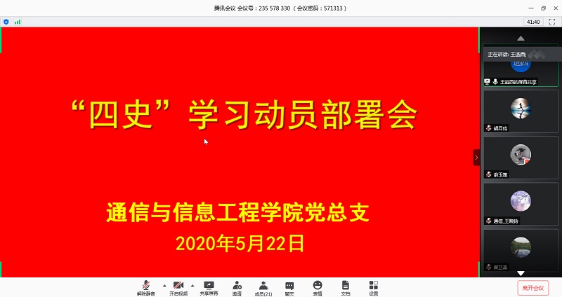 5/span>月/span>22/span>日下午,通信与信息工程学院党总支线上召开“四史”学习教育动员部署会。全体中心组成员参会,党总支书记陈林河主持会议。