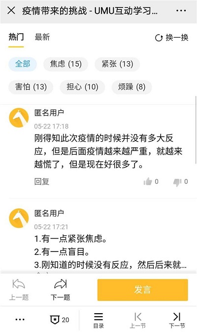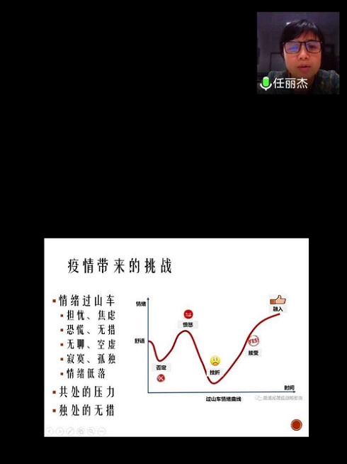 /span> 任老师围绕/span>“疫情下的自我关照与成长”主题展开,详细讲解了在疫情情况下容易发生的心理上的变化及其背后的原因,提供了一些针对性、专业性强的建议和指导,还从“疫情带来的挑战”“疫情的应对”以及“疫情带来的思考与成长”三大方面展开互动讨论。同学们积极参与,讨论气氛热烈。任老师表示,疫情来临让我们充分感受到生命的脆弱,每个人都可能会出现恐慌、焦虑等情绪,但也更容易引发我们对人生的思考和感悟,充分意识到身心健康的重要性,调整自身状态,从而更好地应对未来的机遇与挑战。最后,任老师还与同学们分享了MV《太平志长留》和《奔涌吧,后浪!》,激励同学们向疫情中不懈奋战的英雄们学习,勇于战胜眼前的困难与挫折,做一个积极进取、乐观向上的青年人。
