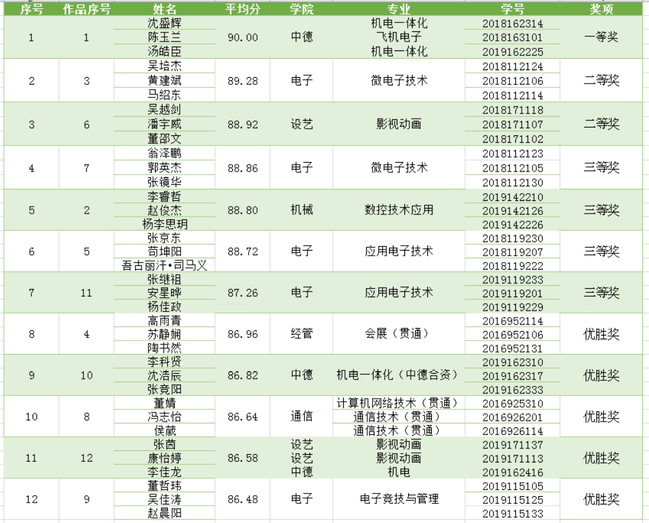 根据剧本概述音频、易班网线上投票和/span>7位专业评委的评分等几个环节,大赛评选出中德工程学院的沈盛辉参赛队、电子技术与工程学院吴培杰参赛队和设计与艺术学院的吴越剑参赛队等团队分别斩获大赛一、二、三等奖和优胜奖。在易班网投票环节中,共有3000多人次有效投票,3号、7号和8号参赛队获得了票数前三名,成功拿到最热人气奖。/span>/span>/span>/p>