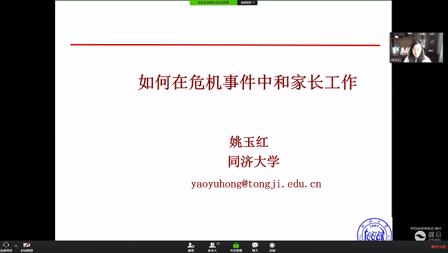 学生心理危机事件关乎学生的生命安全,关乎学生家庭的幸福和谐,关乎学校的稳定发展。为增强学生工作队伍危机干预本领,提高危机化解能力,5/span>月/span>28/span>日上午,学校邀请上海高校心理咨询协会副理事长兼秘书长、同济大学心理健康教育咨询中心副主任姚玉红博士,以“危机中如何与家长工作”为题,面向全体学生工作队伍开展了云端讲座。讲座由学校心理健康教育与咨询中心主任易培主持,各二级学院学管办主任、辅导员近/span>50/span>人参加学习。/span>/span> /span>/p>