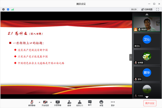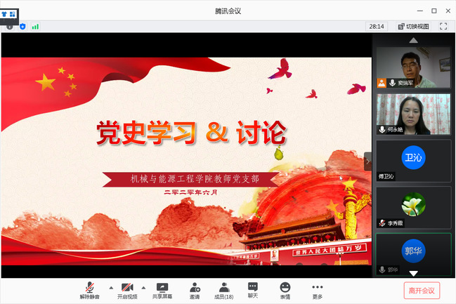 为贯彻落实“四史”学习教育总要求,激发党员信念感与使命感,从“四史”中汲取精神动力,走好新时代长征路,在/span>“七一”/span>即将到来之际,机械与能源工程学院教师党支部/span>于6月16日开展了“党史学习”/span>主题党日活动。/span>校党委副书记、纪委书记毛玉婷到场指导,/span>党总支书记何永艳、副书记郭华、倪娜,副院长陈永平/span>出席会议/span>,教师党支部/span>全体/span>党员参会/span>/span>。/span>/p> /span>/p> 活动以/span>视频会议/span>形式开展/span>,/span>党支部书记窦瑞军根据重要历史节点,梳理了中国共产党的发展历程。党员就学习内容交流了感想,真正感悟到没有共产党就没有新中国,只有共产党才能发展中国。郭华老师认为此次党史学习为大家搭建了较为清晰的知识框架,为深入开展学习奠定了基础。何永艳老师要求大家/span>从/span>历史唯物主义视角观大势、谋大局,更好地从历史中汲取营养,把党史的经验和智慧有机地融入各项工作实践中。 /span>/p> /span>