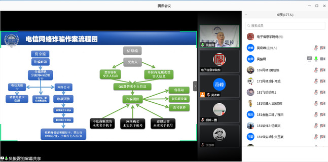 线上线下结合,提高宣传教育效果。今年的安全宣传教育活动,安全保卫处按照学校新冠肺炎疫情防控工作的部署,在落实落细疫情防控措施的同时,创新安全宣传教育方式方法,线上线下相结合、减少人员聚集,实现疫情防控和安全宣传教育“两手抓、双促进”。线上向学生推送安全宣传教育视频及海报,线下悬挂横幅标语、摆放展板,内容涵盖消防、治安、网络安全等,扩大了宣传教育面及影响力,增强了宣传教育效果。6月9日,为提高师生的防范意识和防诈骗能力,/span>学校邀请高校派出所吴振霄警官开展了线上“防范电信网络诈骗”知识讲座,各二级学院辅导员及学生代表参加了讲座。