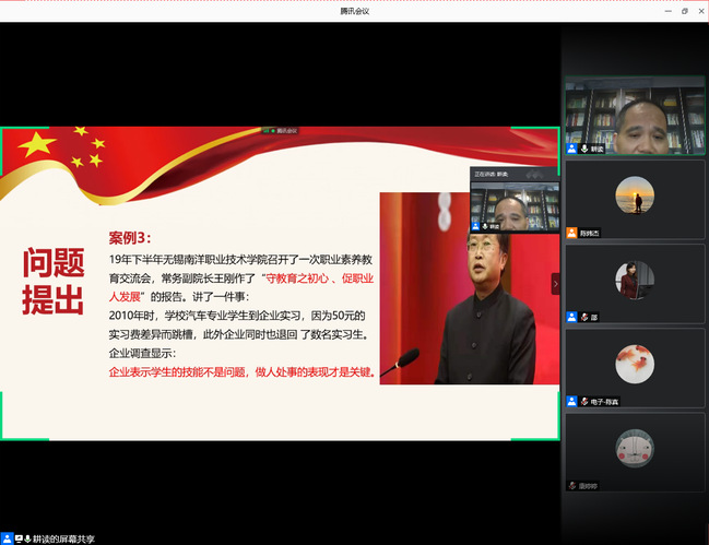 曹建林教授将课程思政在日常工作中的推进和运用细化为“管盯挖化炼引”6字诀和6个“结合”,并围绕“如何教书育人、如何在日常教学过程中真正做到为人师表”这一主题,以详实的教学案例生动讲述,/span>让我们汲取了同行的智慧,深入了解了课程思政在日常教学活动中的实际运用方式。