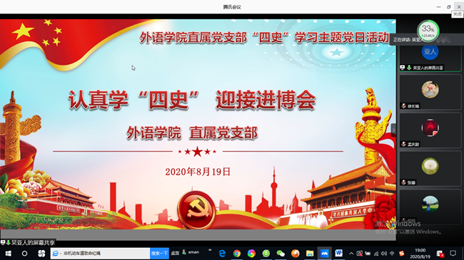 8/span>月/span>19/span>日,外语学院直属党支部在线开展了“认真学‘四史’ 迎接进博会”主题党日活动,支部全体党员参加了本次活动。 /p> /p> /p> /p>