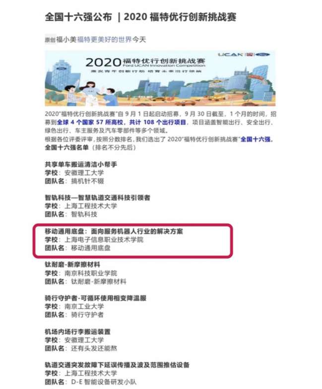 由福特(中国)与恩派公益联合主办的“2020福特优行创新挑战赛”自9月1日起启动招募,9月30日截止,历时1个月,共招募到全球4个国家57所高校,共计108个项目参赛,涵盖智能出行、安全出行、绿色出行、车主服务、出行新型材料、智能出行模式等多个领域。纽约国际官网机械与能源工程学院学生团队“移动通用地盘:面向服务机器人行业的运动解决方案”项目报名参赛,并在全国108个项目中脱颖而出。10月16日福特官方微信公众号公布初赛结果,纽约国际官网“移动通用底盘:面向服务机器人行业的运动解决方案”项目成功晋级“2020福特优行创新挑战赛”全国十六强。