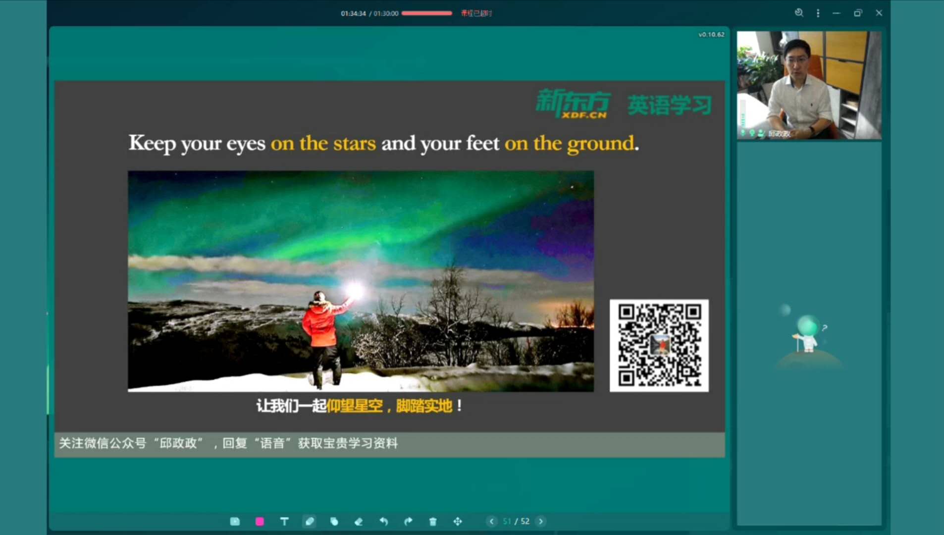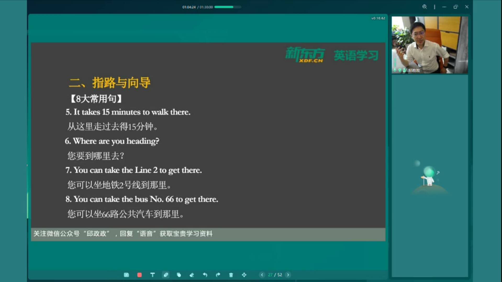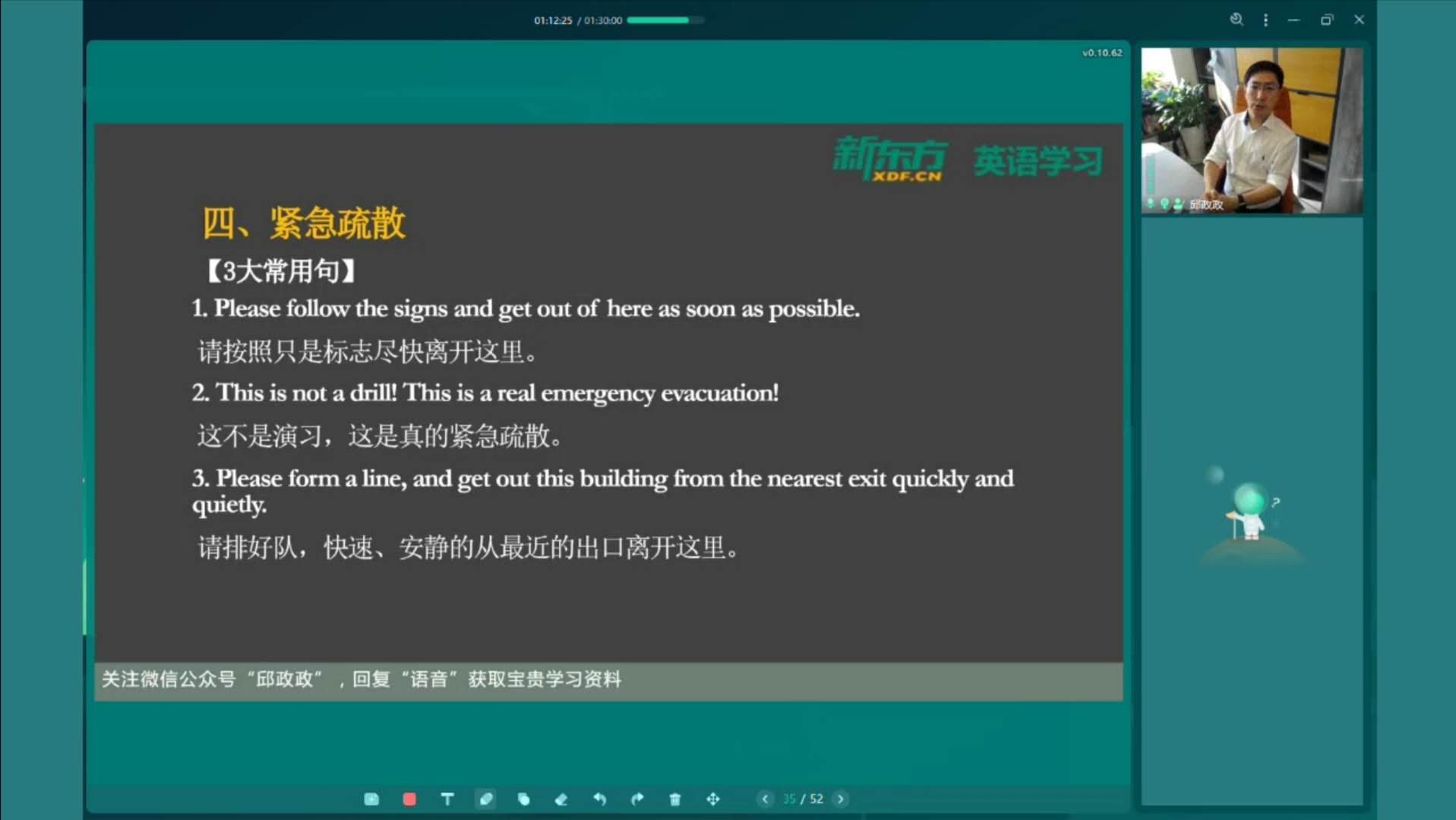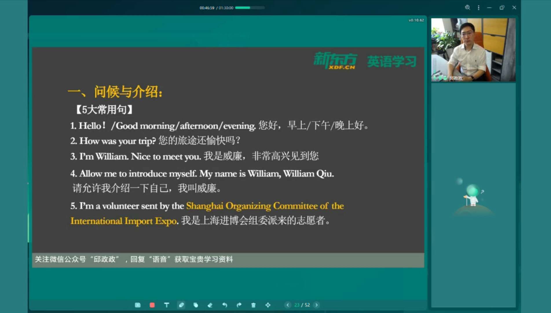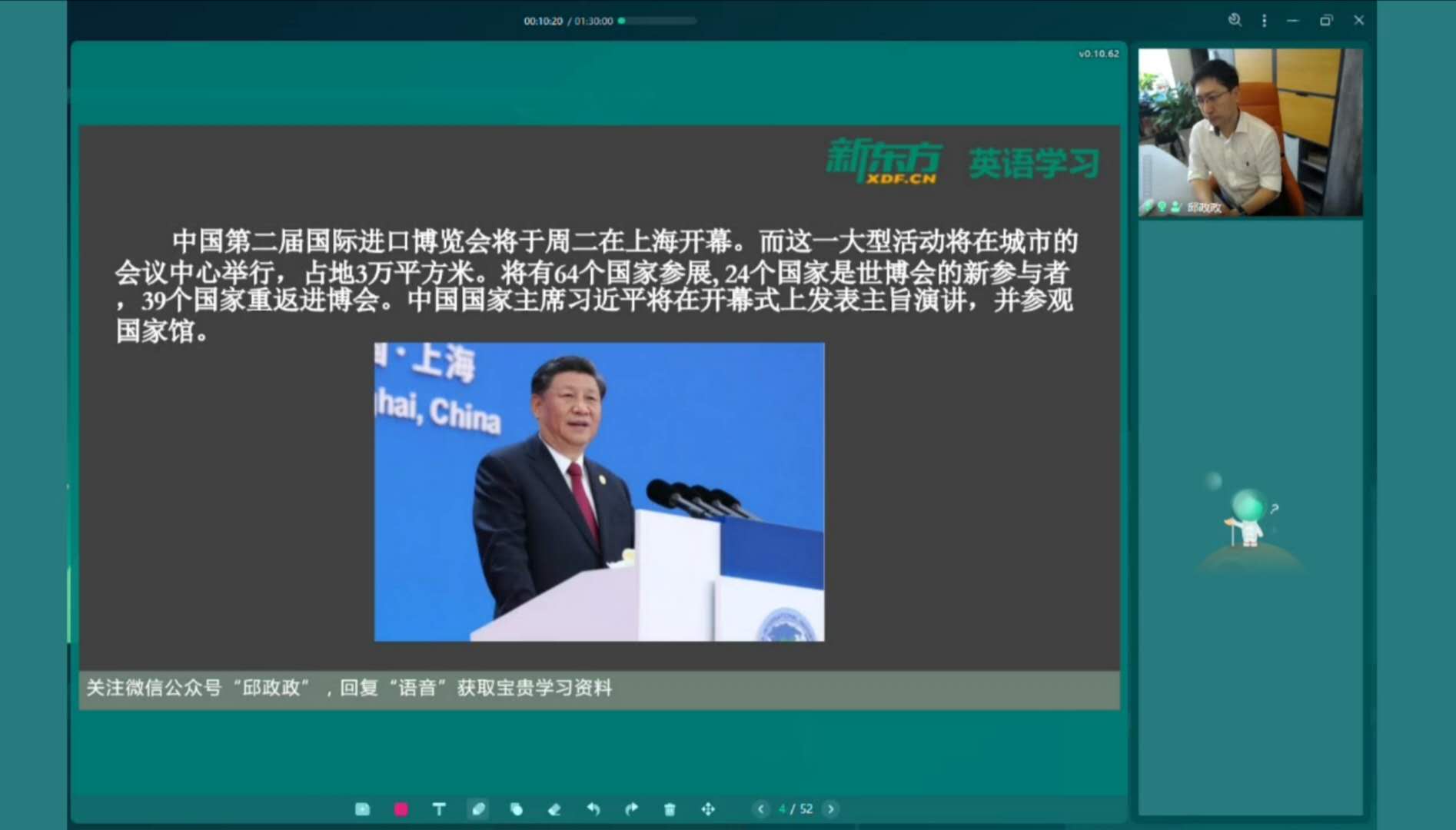 /span> 培训开始前,全体“小叶子”早早守候在/span>直播间前,翘首以盼。/span>13/span>时邱老师如约而至,亲切地用英语向“小叶子”们问好。大家也积极的回应着邱老师问候,线上培训在欢笑中开始。/span>邱老师首先摘录了一段习近平总书记在第二届中国国际进口博览会开幕式的发言作为翻译题,带领大家进入“进博会语境”,感受进博会场环境下的商务语言环境。邱老师逐字翻译、逐句分解,清晰透彻地讲解语法知识及发音标准,让大家如同置身于进博会场。邱老师鼓励“小叶子”张开嘴,勇于读出声,有助于进一步提升表达能力。为提高教学的趣味性,邱老师分享了著名演员刘敏涛老师的学习案例,让大家劳逸结合提高学习效率。他还就英语发音问题进行了探讨,教导“小叶子”在遇到国际友人时如何优雅、礼貌地交谈和回答国际友人的问题,充分细致地做好进博志愿服务工作。/span>课程的最后,邱老师介绍了在遇到医疗急救问题时必备的英语知识,提醒大家在疫情防控常态化下注意保护自身安全,安全高效开展服务。