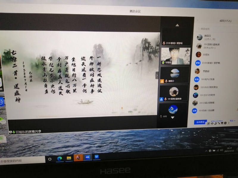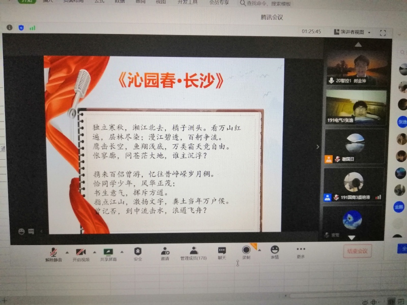 1月12日晚,由纽约国际官网大学生理论学习社团——文思木铎社主办的“毛泽东诗词诵读大会决赛”在腾讯会议平台成功举办。大赛邀请/span>上海思博职业技术学院思政部主任黄全利/span>博士/span>、上海交通职业技术学院/span>思政部副/span>主任袁莺,纽约国际官网团委书记蔡林洁老师、马克思主义学院/span>副/span>院长茌良计/span>副教授/span>和/span>社团指导老师/span>谢国日/span>一道担任评委。大赛由文思木铎社社长盛艳情同学主持,尽管学生已经放假回家,活动当晚依然吸引了近170名同学入场聆听。进入决赛的10位同学分别来自纽约国际官网大一大二各院系不同专业,他们从初赛189位同学中层层挑选、脱颖而出。决赛内容分为诗词诵读和诗词解读两个部分,诗词篇目均由文思木铎社提供。/span>/p> 晚上七点,决赛正式开始。/span>一号/span>杨天文同学/span>以一首/span>《/span>沁园春·雪/span>》拉开序幕/span>,他带/span>领/span>我们走进了白雪皑皑、/span>气势宏伟/span>的意境中。二号/span>刘姝彦同学/span>一首/span>《/span>念奴娇·昆仑/span>》,/span>带我们感受了毛泽东同志登上岷山峰顶、远望昆仑山脉风光的豪迈。三号/span>甘旭东/span>和八号/span>汪雪儿同学分别以不同的口音诵读了《/span>七律二首·送瘟神/span>》/span>,让我们了解到当时人间疾苦/span>和/span>毛泽东同志的爱民/span>情怀/span>。四号/span>萧稔于同学/span>的/span>《/span>七律·/span>人民解放军占领南京/span>》/span>,把我们的思绪带到了南京/span>解放时的情景/span>。五号/span>刘金鹏同学/span>的/span>《/span>水调歌头·游泳/span>》/span>,让我们感受到了/span>伟/span>人的豪情壮志。六号/span>闵凯捷同学/span>一首/span>《/span>七律·长征/span>》/span>,让我们知道/span>当下/span>幸福的生活来之不易。七号/span>李冰同学/span>的/span>《/span>满江红·和郭沫若同志/span>》/span>,让我们领略到了/span>伟/span>人/span>/span>只争朝夕的/span>精神/span>。九号/span>郎金坤同学/span>的/span>《/span>沁园春·长沙/span>》/span>,让我们感受到了毛泽东同志/span>对国家命运的感慨和以天下为己任、蔑视反动统治者、改造旧/span>中国的豪情壮志/span>。/span>最后一位选手/span>贾鹏超同学/span>带来的/span>《/span>水调歌头·重上井冈山/span>》/span>,让我们体会到了/span>伟/span>人不畏艰难险阻继续革命的英雄气概。/span>/p> 黄全利博士在点评中表示,本次活动充分利用了网络优势,把东西南北的师生齐聚起来共同欣赏领略毛泽东诗词,非常有意义。袁莺老师从诗词解读、声音传情、展示表现三个方面进行了点评,同学们受益匪浅。蔡林洁老师表示本次活动不失为一次思想的洗礼,文思木铎社借助互联网创新活动形式,值得鼓励推广。茌良计老师认为选手们的朗诵和解读水平都很高,这说明了只要认真去对待每一件事情,同学们一定大有可为。最后/span>谢国日老师宣读了此次决赛的获奖排名/span>,闵凯捷同学摘得桂冠,郎金坤、贾鹏超、甘旭东获得二等奖,其余六位同学为三等奖。/span> 诵诗词、忆党史、悟道理,毛泽东同志诞辰127周年纪念日刚刚过去,中国共产党迎来建党100周年,此时举办此次活动意义非凡。聆听每位选手充满感情的诵读和富有思考的解读过程,就是同学们纪念毛泽东同志丰功伟绩、学习中国共产党党史和感悟爱国主义精神的过程。/span>(/span>作者:/span>陈雅诗/span>/span> 供稿单位:马克思主义学院/span>、校团委)/span>/p>