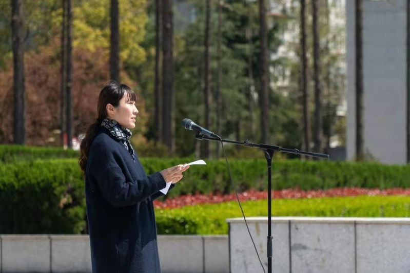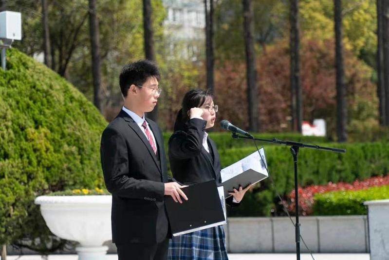 20网络1班张瑄同学代表学生发言,她呼吁大家铭记历史,珍惜当下,继承和发扬先烈的伟大初心与精神力量,为更好地建设伟大祖国积蓄智慧和力量。现场,全体同学在主持人的带领下,面对国旗,举起右拳,进行了庄严宣誓。/p>