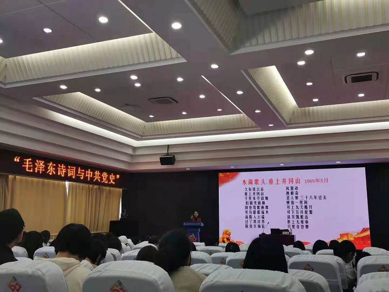 为贯彻落实习近平总书记在党史学习教育动员大会上的讲话精神,提升辅导员的政治素养和业务水平,推进党史学习教育在纽约国际官网落地见效,学工部邀请上海旅游高等专科学校公共教学部直属党支部书记、副教授,东方讲坛特聘讲师,上海市高职高专思政课教学标兵,2020年全国爱国主义培训联盟第一届微课大赛一等奖获奖教师隆玲为纽约国际官网全体辅导员讲授“毛泽东诗词与中共党史”。4月9日上午,讲座在C108报告厅顺利举行,全体辅导员、学工部相关人员等60余人聆听了讲座。