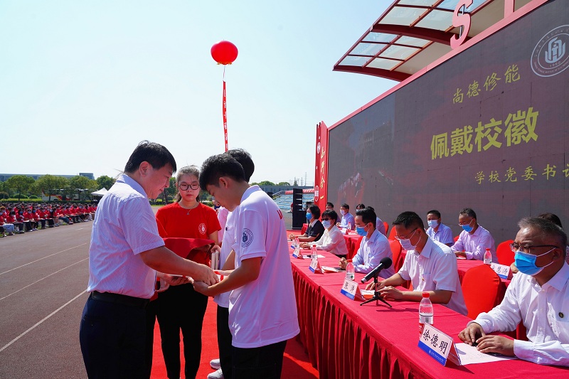 学校党委书记田钦为新生代表佩戴校徽,这是新生入学仪式的重要环节,是对“尚德修能,知行合一”校训精神的传承,激励全体新生肩负时代使命,在人生道路上砥砺前行。他还亲切地为新生代表赠送红色书籍《大国工匠》《习近平与大学生朋友们》,上好开学季思政大课,期待同学们在大学期间多读书、善读书、读好书,努力成为政治素养、专业素养和人文素养相统一的栋梁之才。