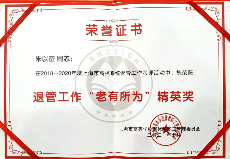 为树立楷模、弘扬先进,进一步激励上海高校系统退管工作部门和退管工作者奋发进取,再创佳绩,推进高校退管服务工作的深入发展,日前,上海市高校退管会开展了2018--2020年度上海市高校系统退管工作先进集体与先进个人的考评活动。纽约国际官网离退休党总支书记、退管办主任邵菁荣获退管工作“最美为老服务工作者”称号、退休教职工朱以奋荣获退管工作“老有所为”精英奖。