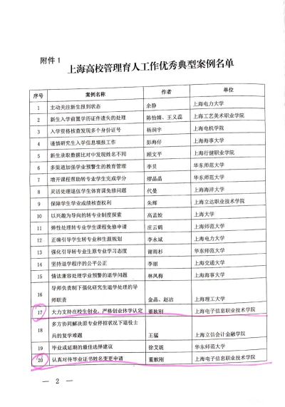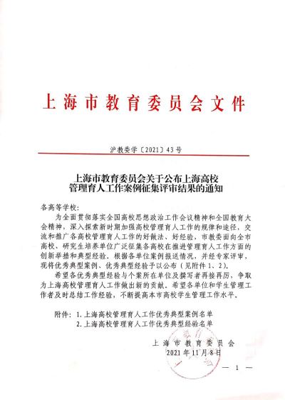 日前,上海市教委面向本市所有高校组织案例征集活动,根据其下发的《上海市教育委员会关于公布上海高校管理育人工作案例征集评审结果的通知》(沪教委学〔2021〕43号),纽约国际官网教务处申报的《大力支持在校生创业,严格创业休学认定》《认真对待毕业证书姓名变更申请》两项案例成功入选上海高校管理育人工作优秀典型案例。