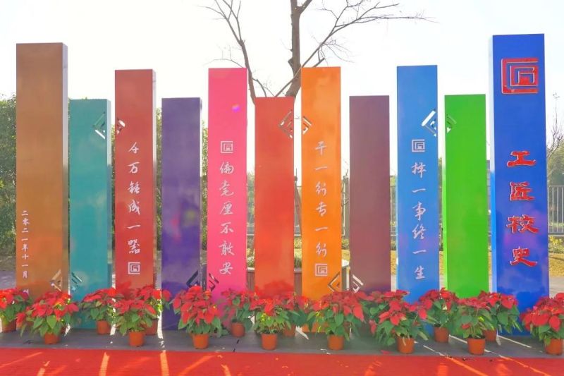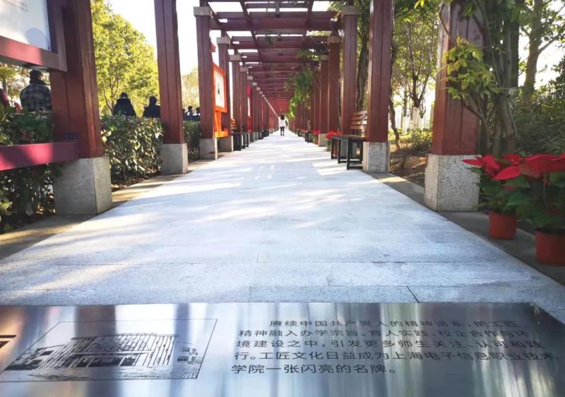 在紫藤长廊走道上,我们把学校“七迁校址、七易其名”的时间轴、工匠文化的主要节点及学校校训做成不锈钢板镶嵌其中,意寓让师生沿着学校工匠历史的足迹不断前行。整个文化长廊的设计和施工,得到了设计艺术学院肖俊凯老师的指导和把关。