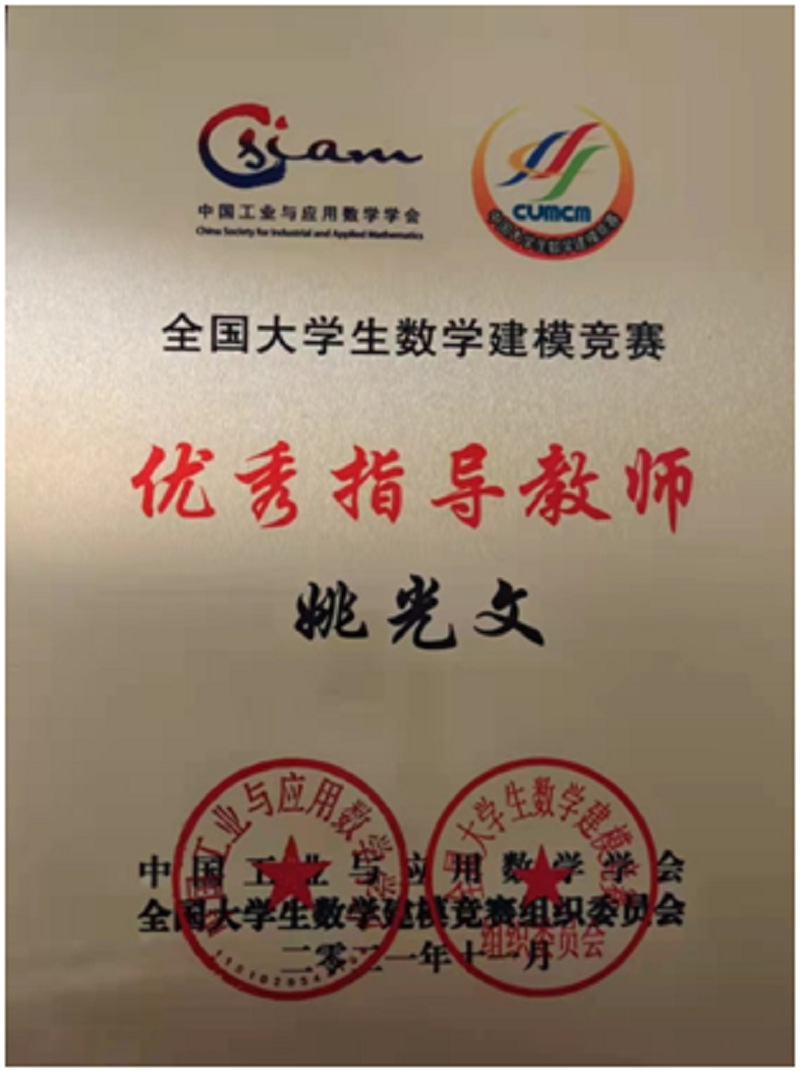 值此全国大学生数学建模三十周年之际,全国大学生数学建模竞赛组织委员会特意授予纽约国际官网公共基础学院院长姚光文“优秀指导教师”荣誉称号,以表彰他18年来对数学建模竞赛全方位的支持和贡献。此次参赛获奖,是纽约国际官网创新人才培养模式,积极推进数学教育教学改革的一个里程碑。(供稿:公共基础学院)