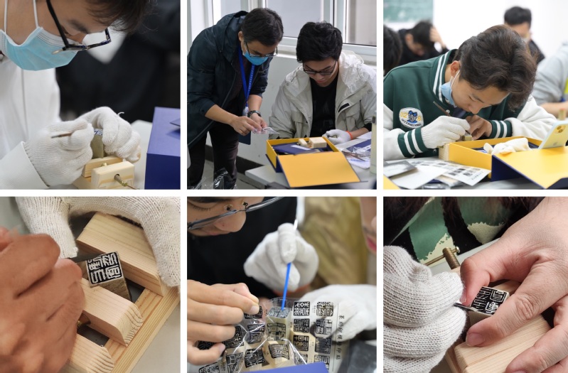 刘老师从篆刻的演变历史、古文字解读以及名作欣赏开始,将篆刻的前世和今生娓娓道来。篆刻讲究篆法、章法、刀法三法,不仅是艺术的体现,也是为人的哲学,在方寸之间雕琢人生。过程中,刘老师还仔细讲解了篆刻材料、篆刻临摹、刀法练习等技巧技能,为大家初步创作打下了良好的基础。在练习过程中,同学们埋头苦练、刻刀飞舞,展现出一一幅幅“能工巧匠”的精神风貌。