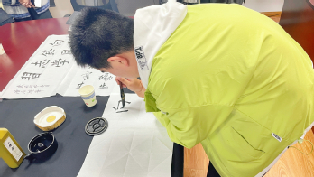 学院党总支副书记郭华,副书记、副院长倪娜对三角洋社区老师的到来表示欢迎。讲座中,陆宝雷老师以通俗易懂、幽默风趣的语言,讲授了书法入门知识、如何鉴赏书法以及学习书法的要旨。倪谭辰老师亲自示范,挥毫泼墨,书写党的二十大报告金句以及习近平总书记关于雷锋精神的重要讲话,笔触深沉、墨翰飘香。师生真切感受到书法的魅力,纷纷拿起笔墨,临摹学习老师的佳作。讲座现场互动频繁,气氛活跃融洽。