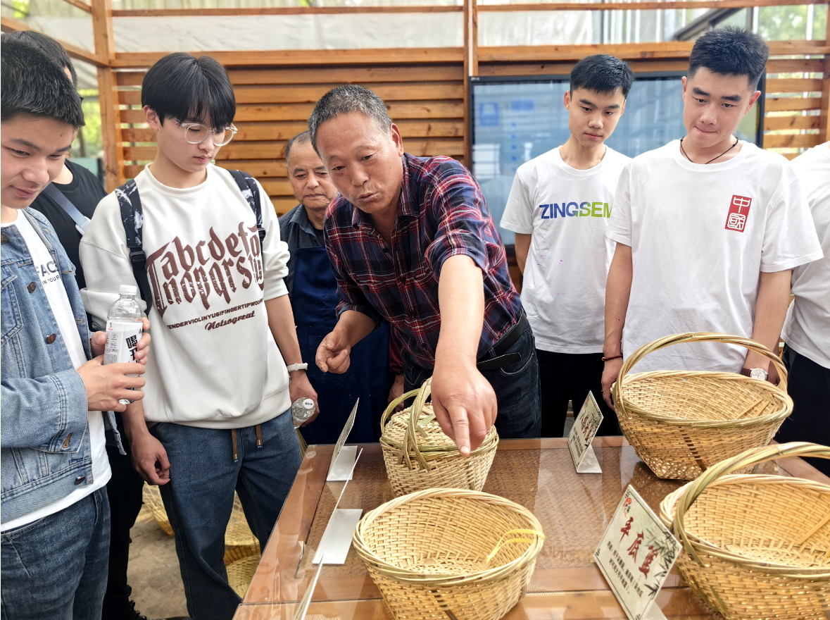 为了让学生在实践中学习、传承非遗文化、增强文化自信,车站村非遗文化传承人潘进福老先生给学生介绍了龙潭竹编的历史和工艺特征等,并现场教授学生如何制作竹编。同学们在竹编制作过程中对竹编的材料特性、工艺要求等有了更加深刻的了解,通过零距离体验感受非遗的魅力和深厚的文化底蕴。