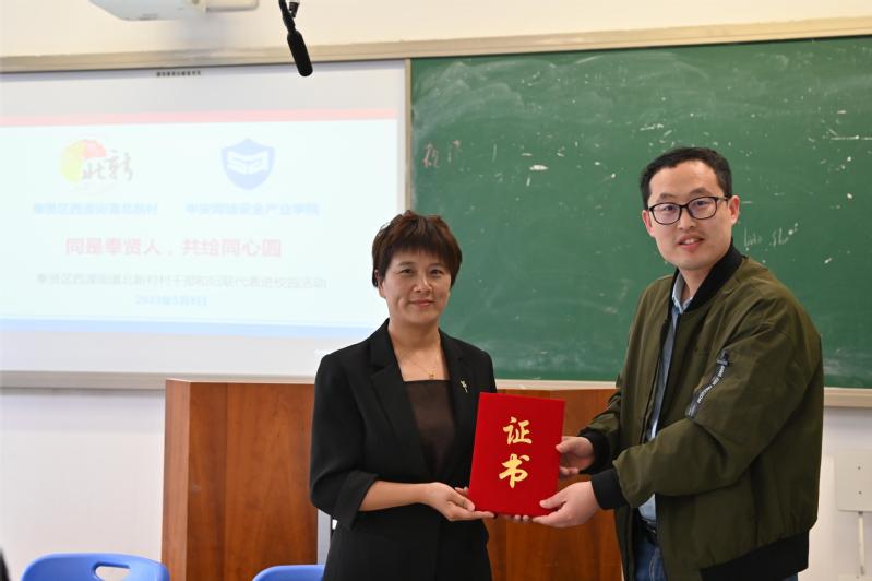 为大力加强新时代高校学生劳动教育工作,切实推进产教融合、劳教结合,2023年5月8日,申安网络安全学院邀请奉贤区西渡街道北新村20名村干部进校园,开展“同是奉贤人,共绘同心圆”交流互动活动。让新时代大学生近距离接触村干部,厚植劳动基因,同时也让新时代村干部了解当代高职院校教育发展情况。北新村党总支书记朱伟英,学工部副部长吴奇峰受邀参加本次活动。申安网络安全产业学院直属党支部书记、院长何永艳主持会议。