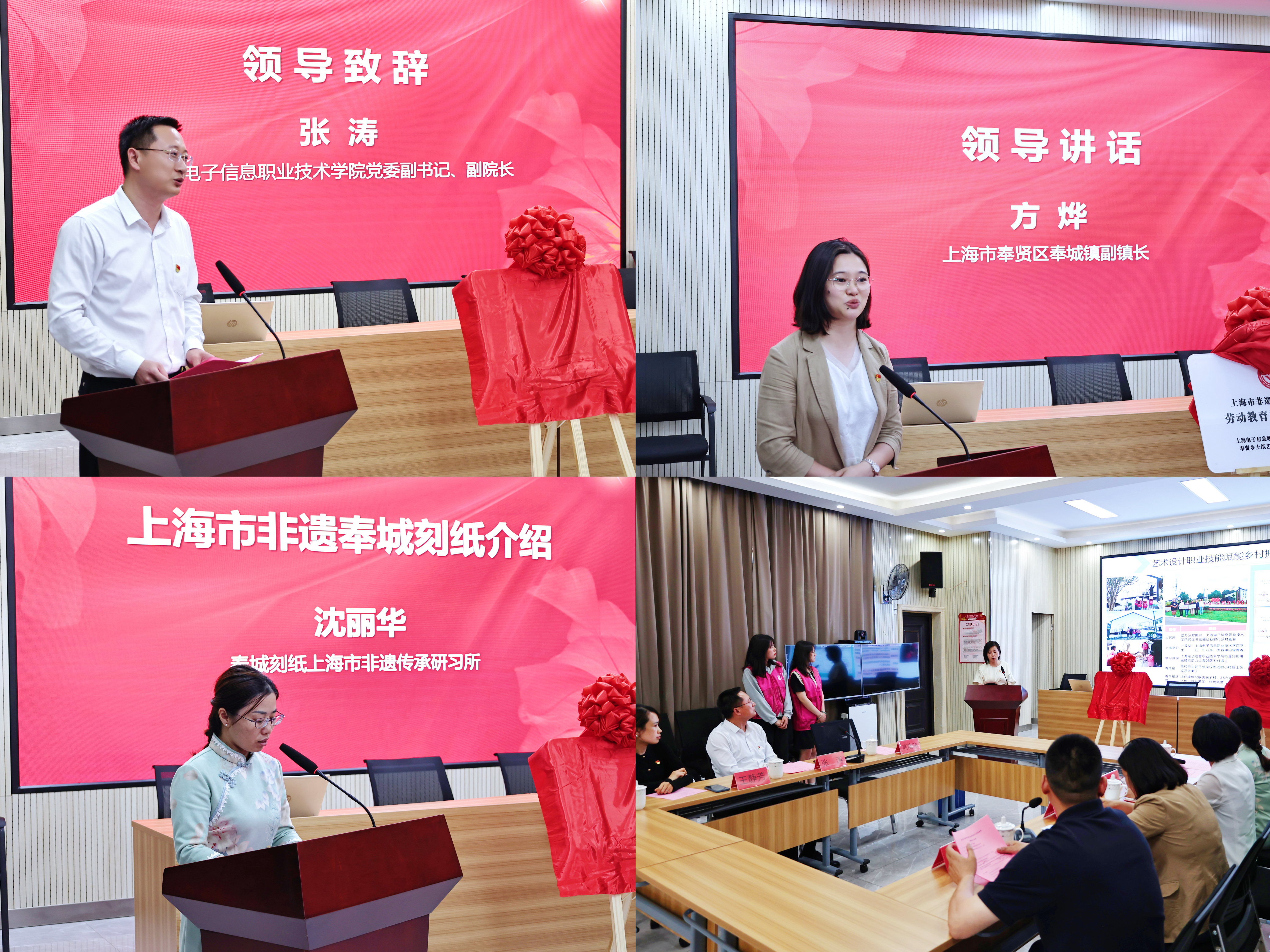 沈丽华介绍了奉城刻纸的发展及传承情况,并表示传习所将充分发挥作为大学生劳动教育校外实践基地作用,将非遗文化价值、技艺智慧和工匠精神融入到青年学生的教育当中。方烨作总结讲话。她表示,奉城是一个“千年古镇”,孕育着深厚的红色文化和非遗文化。近年来,奉城镇不断加大红色文化弘扬和非遗文化传承赋能乡村振兴。校外实践基地将成为各位师生传承非遗的鲜活课堂,希望同学们通过刻纸课程技艺的学习,结合艺术设计的特长,探索“非遗+”创新思路,创作更多“非遗+”作品。奉城镇相关部门也将搭建平台供优秀作品展览展示,一起铺陈艺术道路,弘扬传统文化。