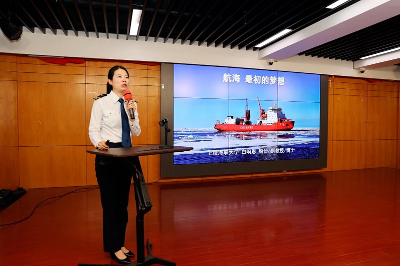 在讲座中,白响恩老师以“航海,最初的梦想”为题,分别从“为什么选择航海”“从事航海教学与科研”“投身航海科普和社会公益”三个方面与在场师生分享了她与航海的故事。白老师结合科考途中的所见所闻所感,运用鲜活生动的事例、风趣幽默的语言、精彩纷呈的图片和视频,呈现了科考队员不畏艰险、勇于进取的精神以及美丽的北极风光。北极恶劣的天气,浮冰、冰山、海雾等各种航行过程中的障碍和危险,时差混乱、日夜颠倒的航行生活都没有难倒这位坚强、冷静、睿智的女驾驶员。从“育锋”轮到“雪龙”号,再到中国首位穿越北冰洋的女航海驾驶员,初心和梦想一直支撑着白响恩前进。
