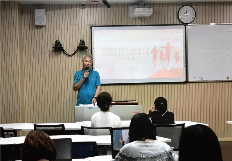 吴亚人书记领学了习近平总书记在6月2日北京文化传承发展座谈会上的重要讲话精神。全体党员围绕“坚定文化自信、建设文化强国”进行交流研讨。党员老师们纷纷表示要自觉担负起在新的起点上继续推动文化繁荣、建设文化强国、建设中华民族现代文明的文化使命,立足外语教育的实际,积极响应习近平总书记关于“坚定文化自信、担当使命、奋发有为,共同努力创造属于我们这个时代的新文化,建设中华民族现代文明”的号召。