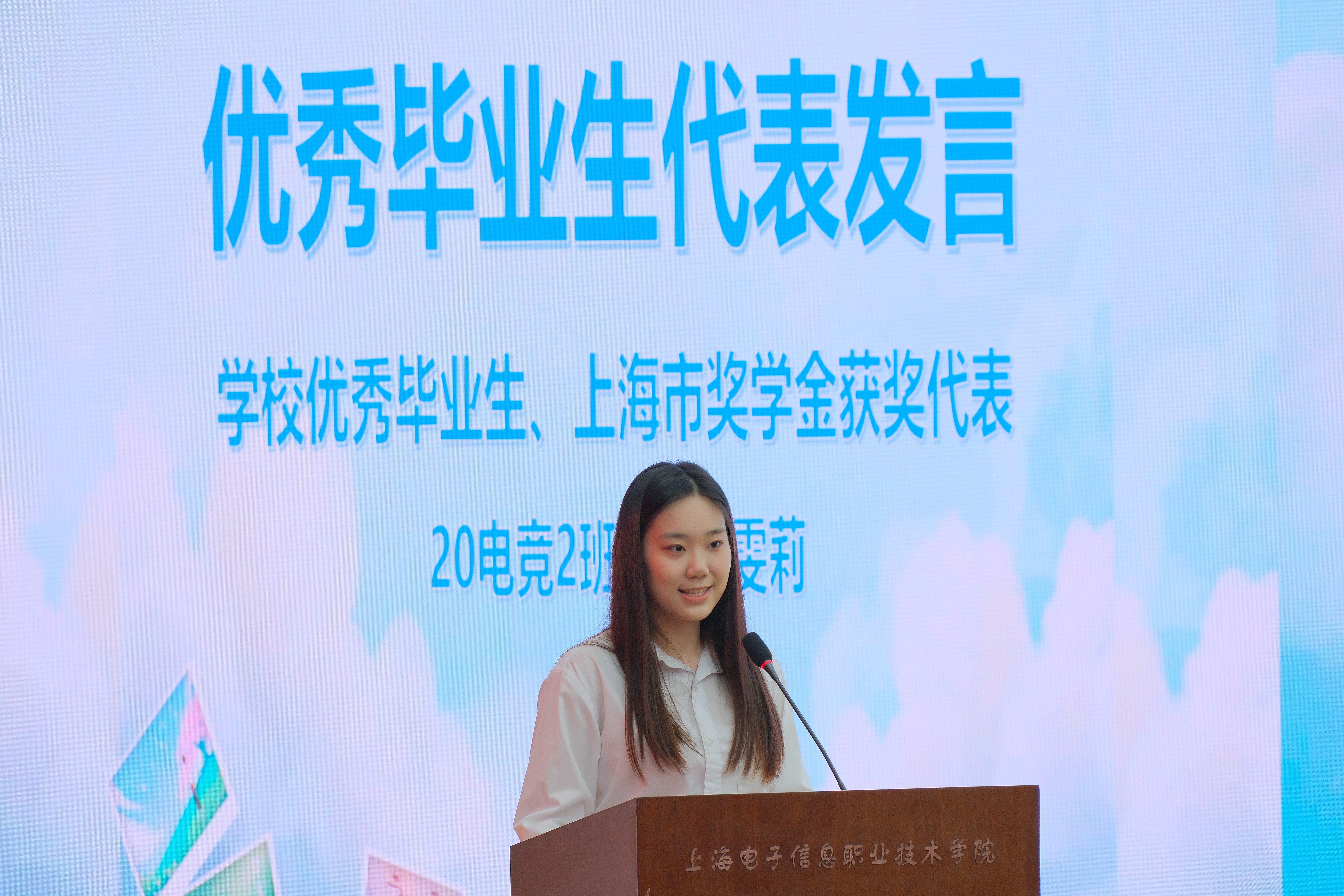 青春不散场,扬帆新启航。上海市优秀毕业生、国家奖学金获奖代表郭海银和学校优秀毕业生、上海市奖学金获奖代表吴雯莉作为毕业生代表发言。他们表示,在以后的学习、工作、生活中,将坚持知识与实践并重,学识与技能相长,在新的起点上心怀从零开始的勇气,永葆求知探索的初心,在未来的人生中为梦想披荆斩棘,奋力奔跑,努力成为可堪大用,能担重任的栋梁之才。