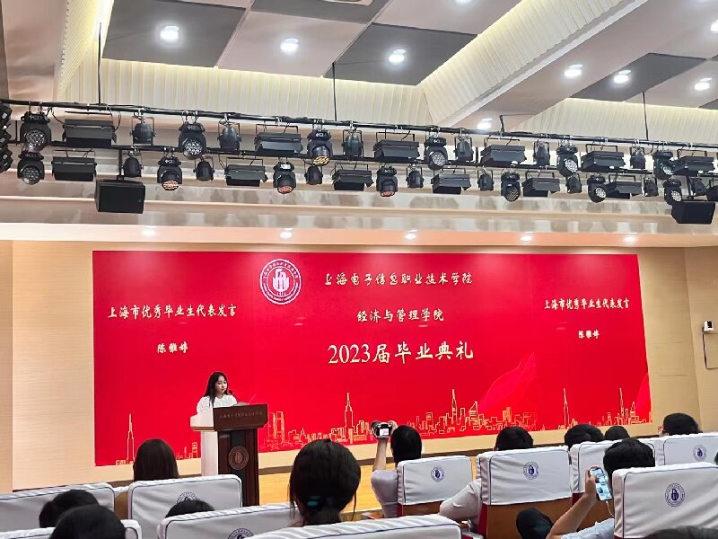 上海市优秀毕业生代表陈雅婷在发言表示,“尚德修能,知行合一”的校训一直激励着每一个电子信息学子奋楫争先,勇毅笃行。回想起在校期间的点点滴滴,感谢学校和老师三年的培养与教导,让他们有勇气和能力在追逐梦想的路上永远做无畏的少年。
