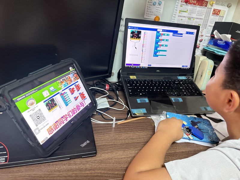 黄燕老师负责的“电子指南针编程”线上体验项目以直播的方式进行集中授课,共有120名中小学生报名参加。她以我国古代四大发明之一的指南针为主题,在介绍中国古代科技成就的同时带领学生们认识Micro:bit硬件,学习在线编程软件使用,最终实现电子指南针制作。
