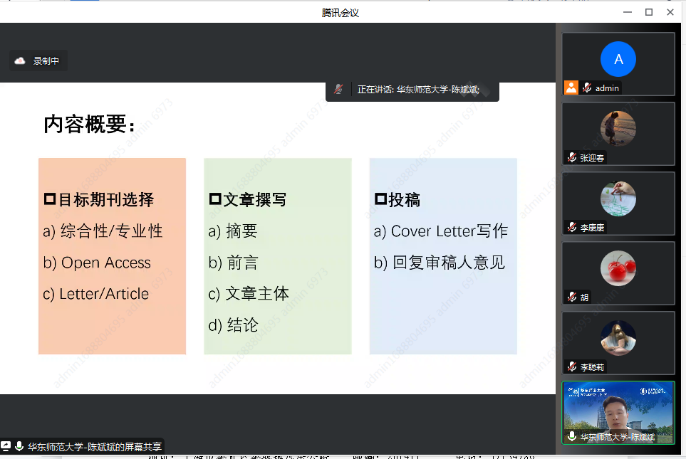 陈斌斌老师作为华东师范大学紫江优秀青年研究员,入选国家自然科学基金优秀青年科学基金项目(海外)、上海市海外人才引进计划,主持上海市科委青年科技英才扬帆计划及国家自然科学基金委青年项目,在氧化物电子学领域发表SCI学术论文三十余篇,有不少发表于Sicece、Nature等自然科学类顶级刊物,在钙钛矿结构过渡金属氧化物薄膜的外延生长及其电、磁学性质研究等专业领域拥有丰富的研究经验。会上,他重点根据自身经验全面阐述了分析了SCI国外目标期刊的选择问题,强调需要考虑的综合因素。而后主要从题目、摘要、前言、正文和结论等方面对撰写过程中写法技巧进行具体剖析,并结合实际案例进行阐释论证。最后,他对投稿环节的投稿信写作和回复审稿人意见作了出专门具体指导,详细说明了注意事项。通过此次专题报告会培训,陈斌斌老师在线生动展示现了一篇高水平SCI论文从撰写到见刊的详细流程全生命周期,并且毫无保留地分享了自身在实践中总结出的宝贵经验。会议围绕投稿论文规范性问题展开了积极讨论。